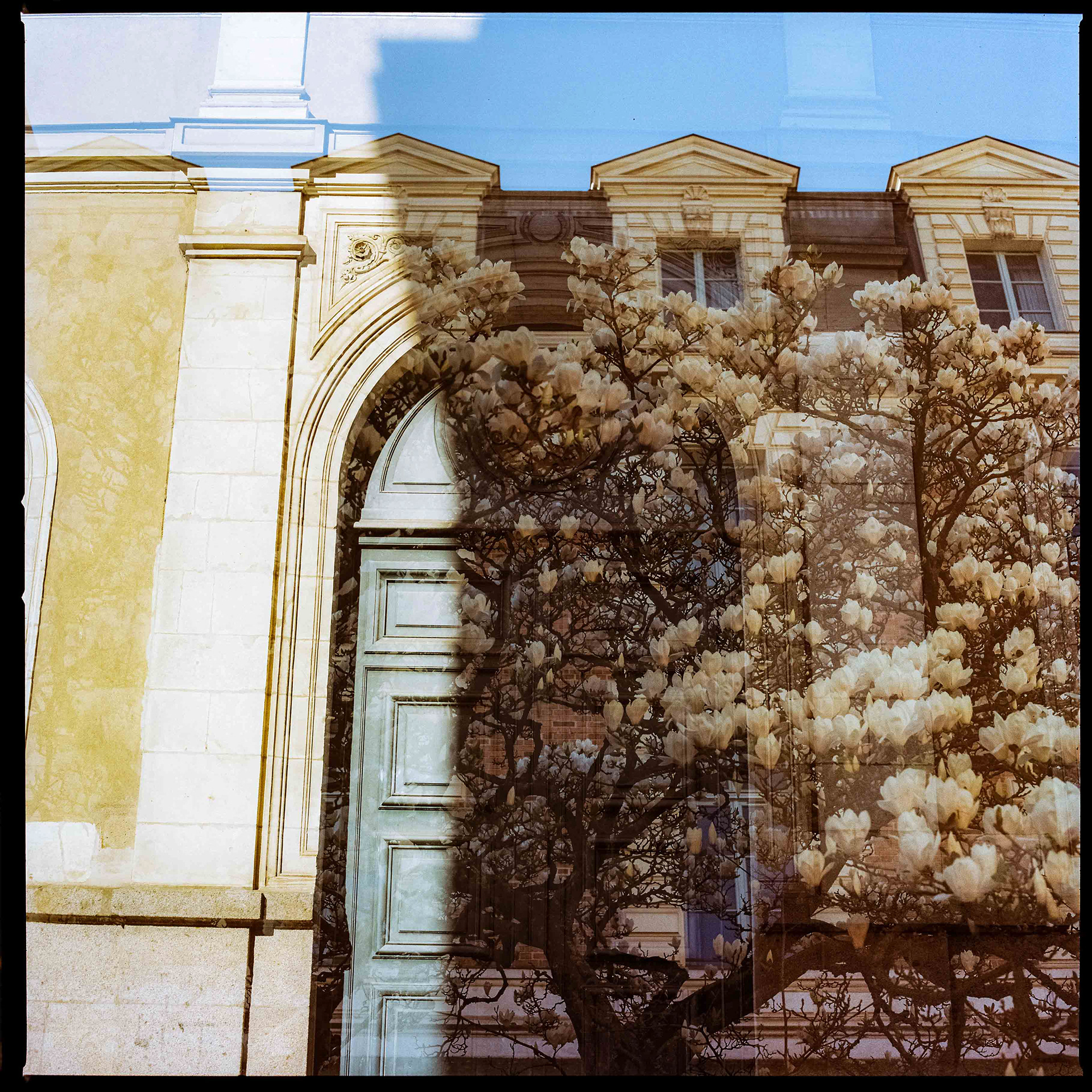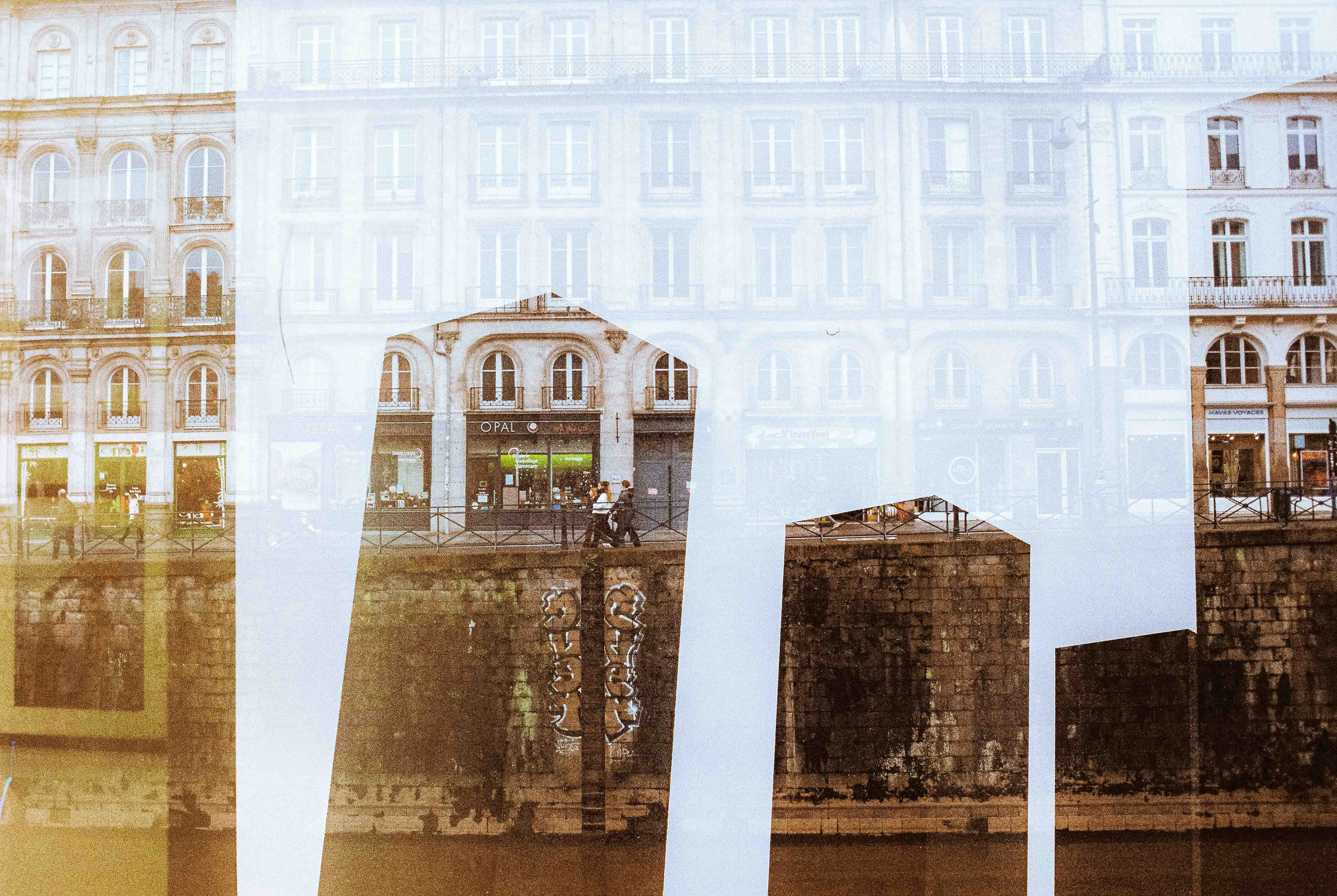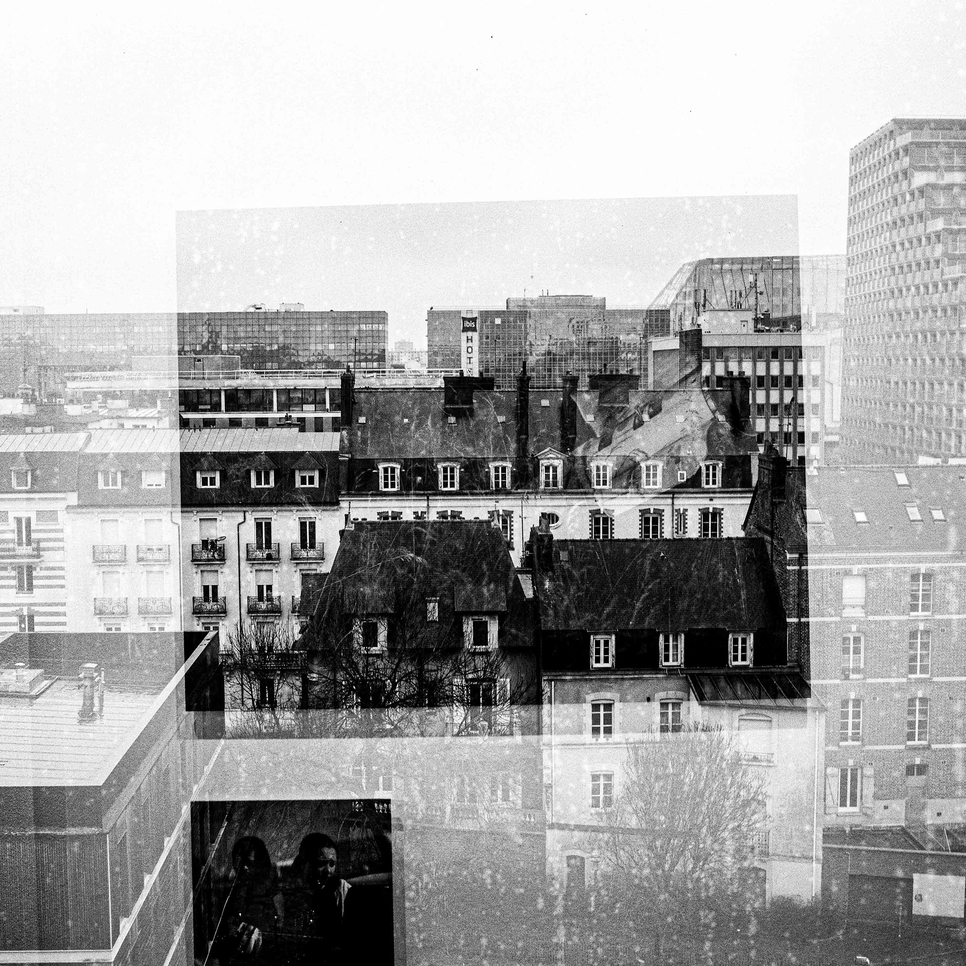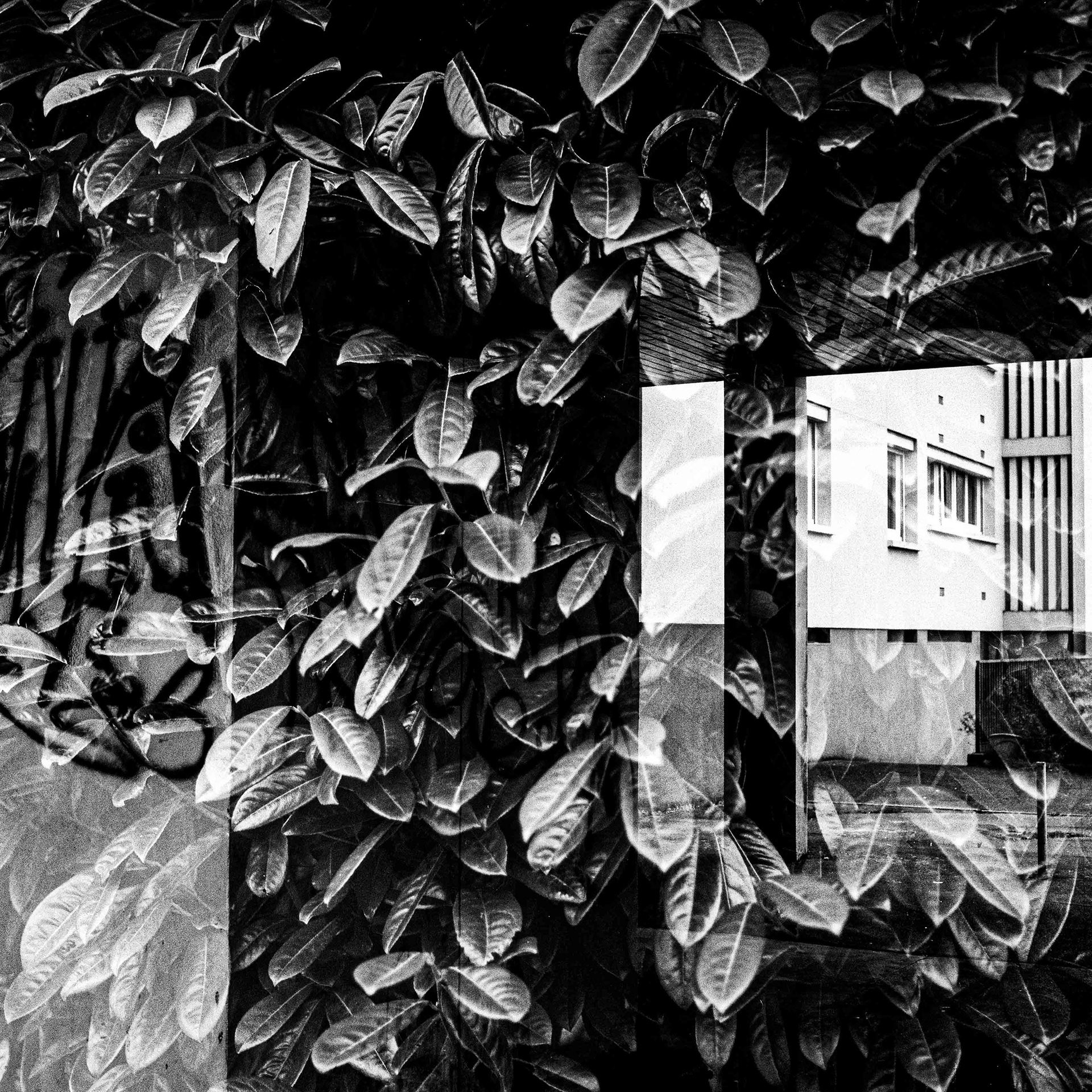 La double exposition est une technique photographique qui consiste à superposer plusieurs images, selon plusieurs procédés. Ici, elle est réalisée à l'argentique, en déclenchant plusieurs fois l'appareil dans des environnements différents, sans faire avancer la pellicule, ce qui créer cette superposition de couches. Ce procédé me permets de mélanger, les lieux, les textures, les formes, les lumières et les ombres en créant des images riches, à la limite de la compréhension.