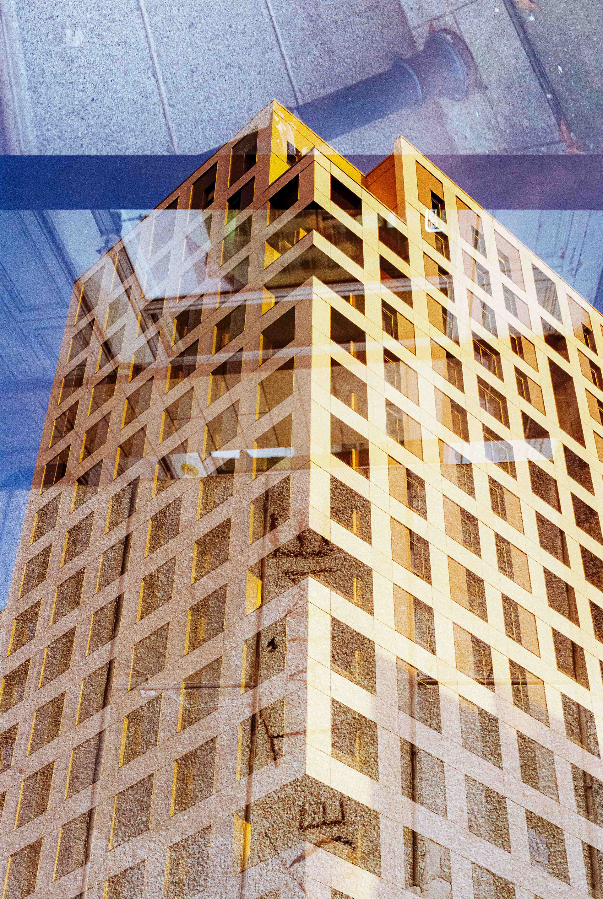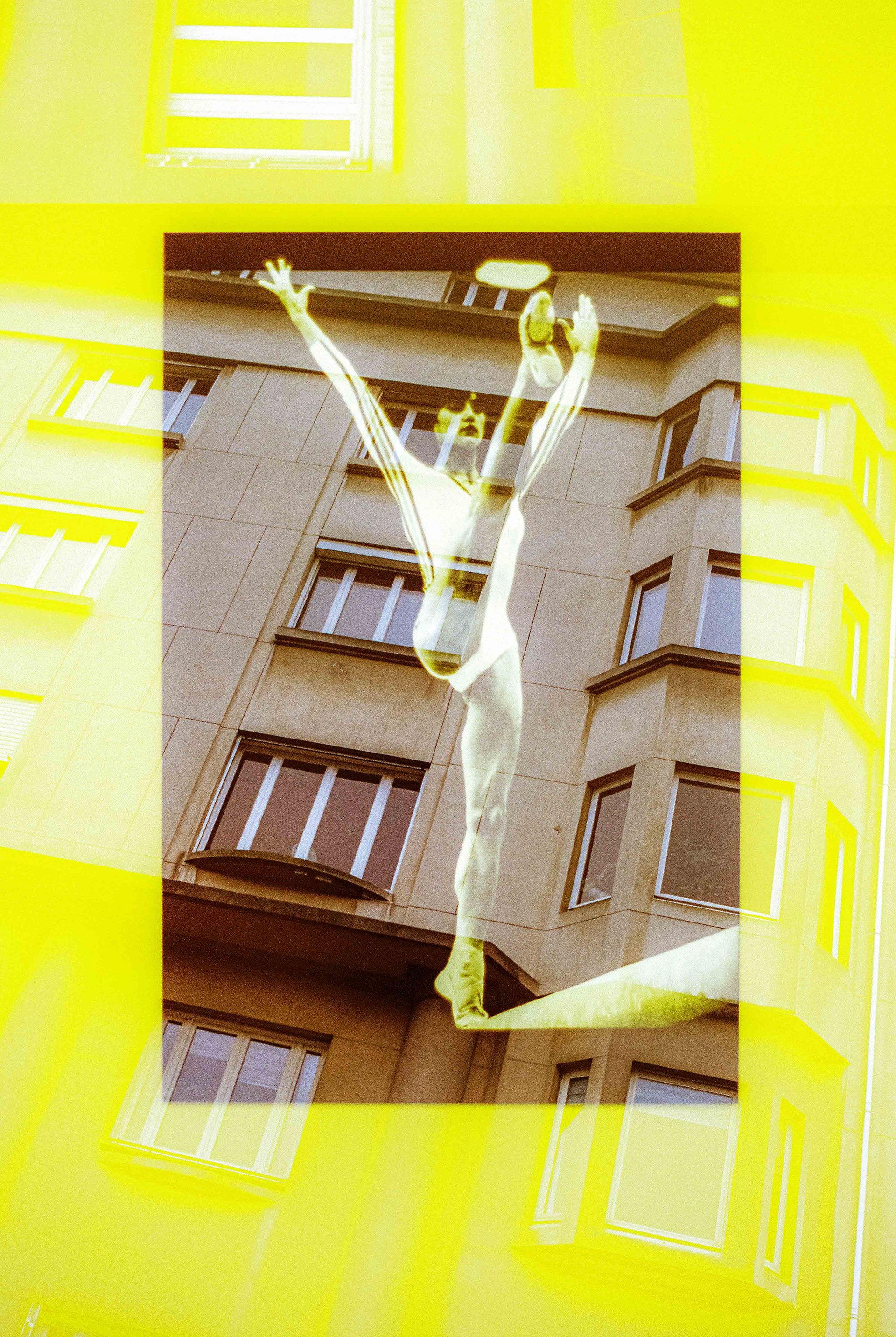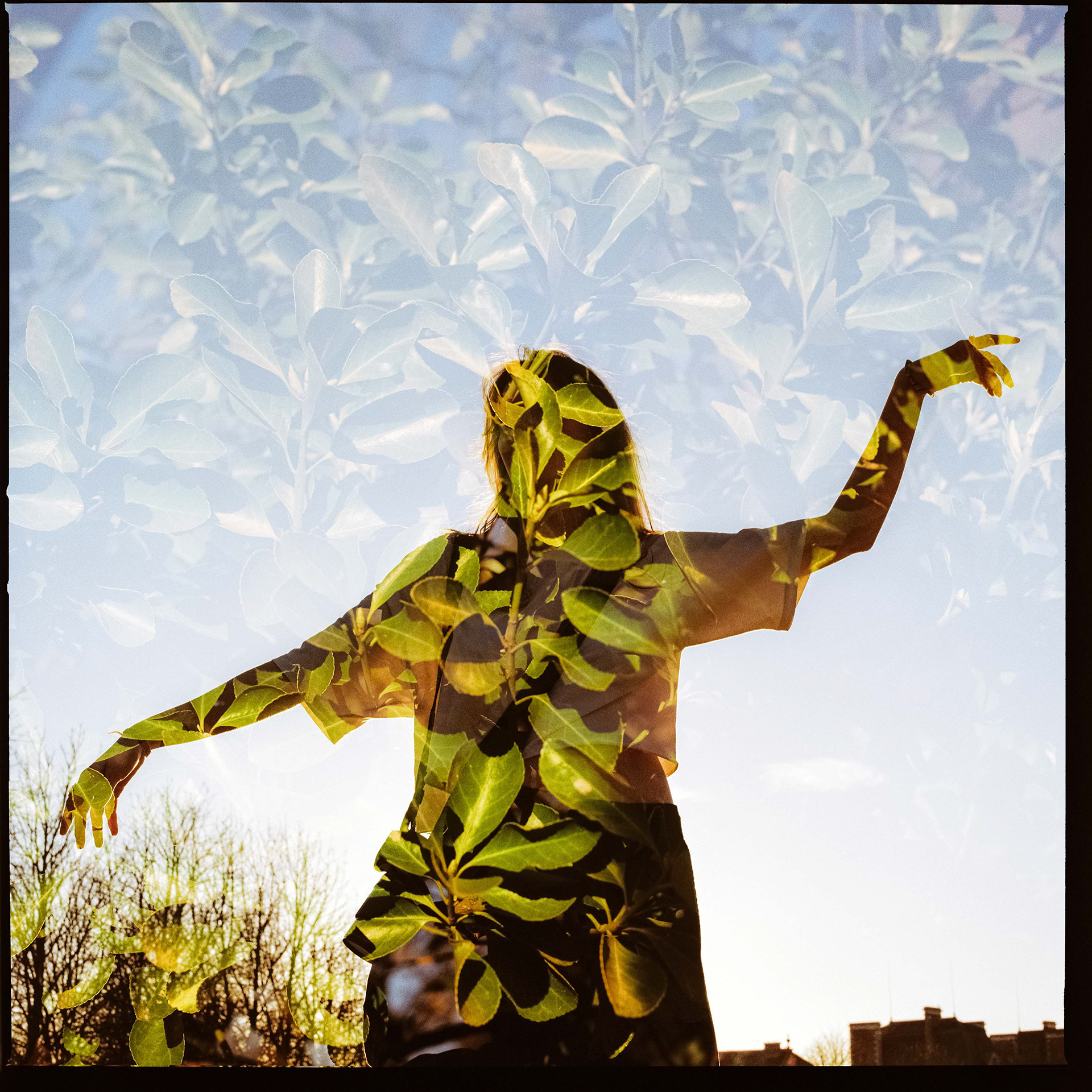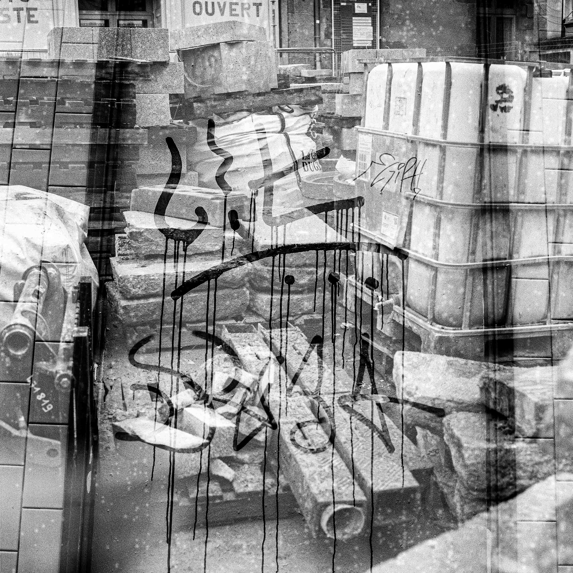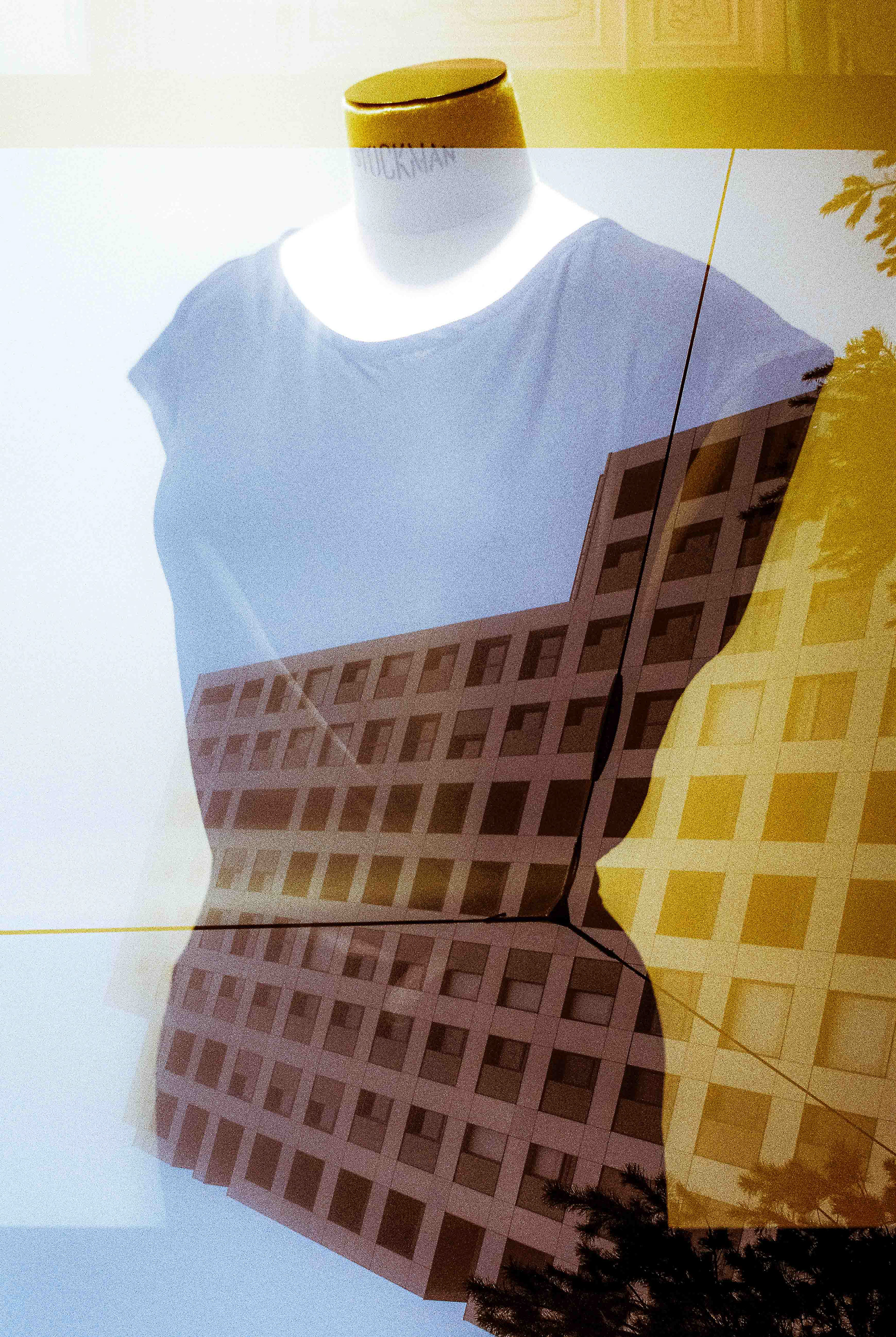 La double exposition est une technique photographique qui consiste à superposer plusieurs images, selon plusieurs procédés. Ici, elle est réalisée à l'argentique, en déclenchant plusieurs fois l'appareil dans des environnements différents, sans faire avancer la pellicule, ce qui créer cette superposition de couches. Ce procédé me permets de mélanger, les lieux, les textures, les formes, les lumières et les ombres en créant des images riches, à la limite de la compréhension.